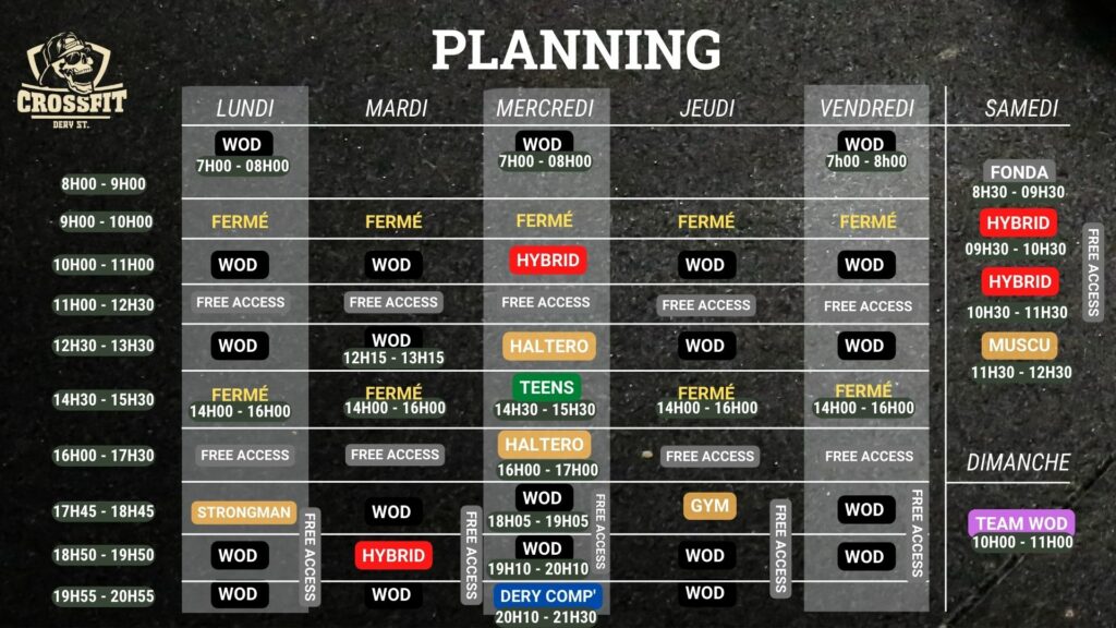 Ce sont des créneaux où vous vous entraînez en complète autonomie à l’aide de notre programmation individuelle. Profitez de ces créneaux pour travailler vos faiblesses par exemple. Principalement entre 11h et 12h30 ou entre 16h et 17h30.